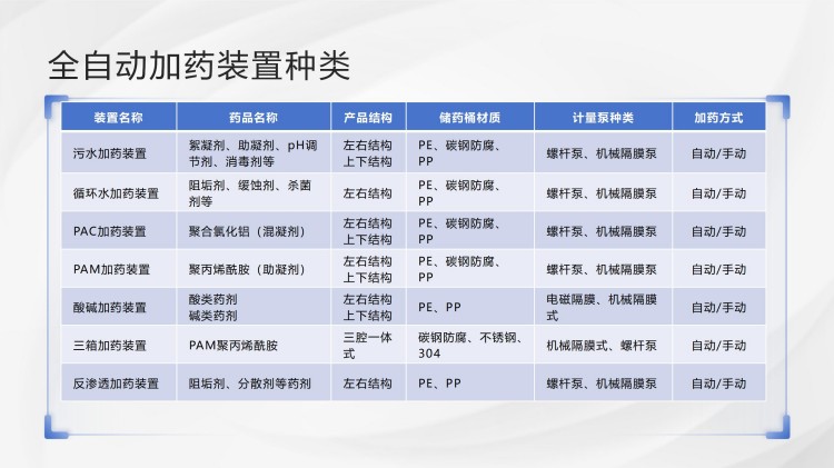|藥劑類型 |液體藥劑:需防腐儲罐+攪拌防沉淀;<br>干粉藥劑:配自動投粉機+防潮措施。 |